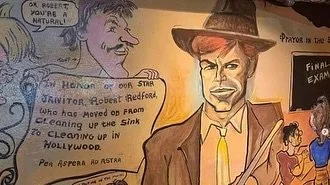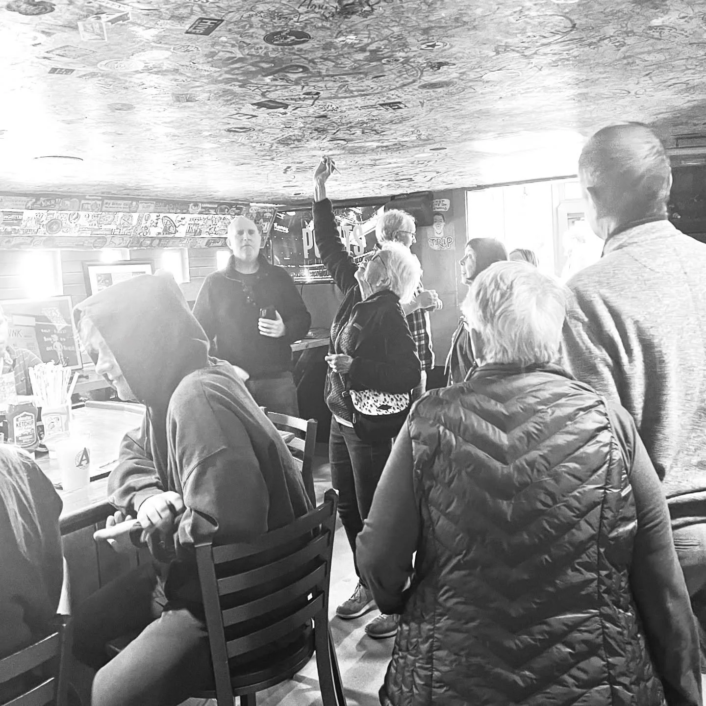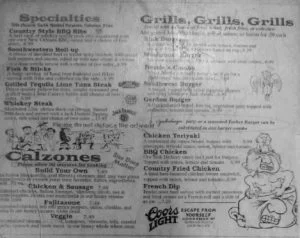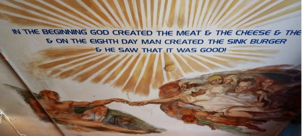 If you’ve ever been into The Sink, you’ve walked underneath Llloyd Kavich’s “Sinkstine Chapel” on the ceiling of the entryway. This brilliant re-creation of Michelangelo’s “The Creation of Man” shows God handing a Sinkburger to Adam and perhaps some Sink Rats. The Sinkburger is a classic hamburger made with shredded American cheese, lettuce, tomato, onion, pickle, and The Sink’s famous hickory sauce.