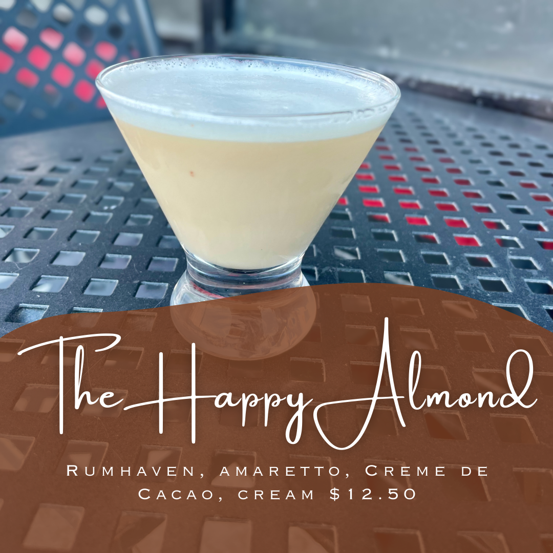 THE HAPPY ALMOND MARTINI Rumhaven, amaretto, Creme de Cacao, cream