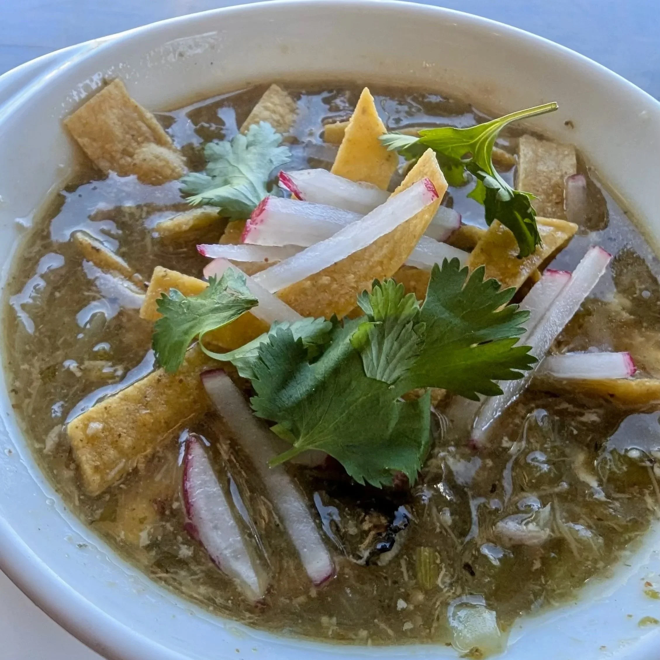 Smoked pork simmered with onions, Hatch chiles, tomatillo, cilantro, and spices, then finished with tortilla strips, radish, and fresh cilantro