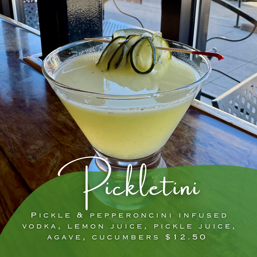 PICKLETINI Pickle & pepperoncini infused vodka, lemon juice, pickle juice, agave, cucumbers