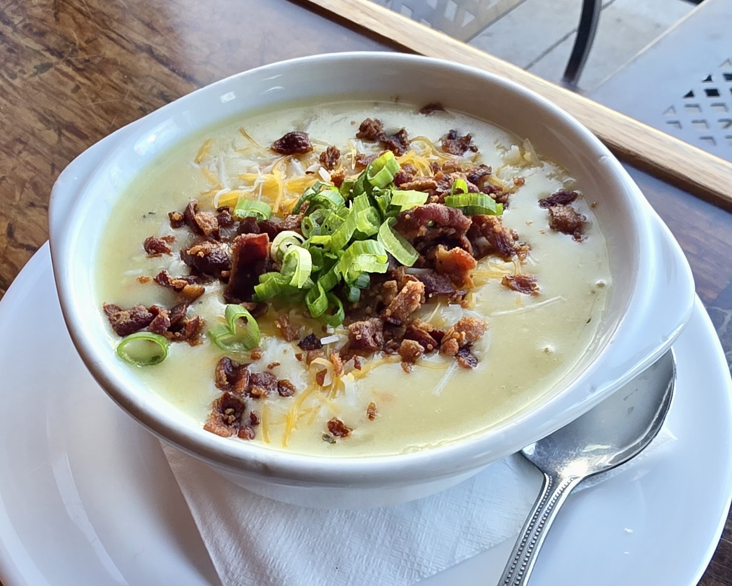 Creamy baked potato soup made with Fontina, carrots, celery, onions, and garlic, simmered with chicken and vegetable stock, then topped with Jack cheese, bacon, and scallions (gluten-free)
