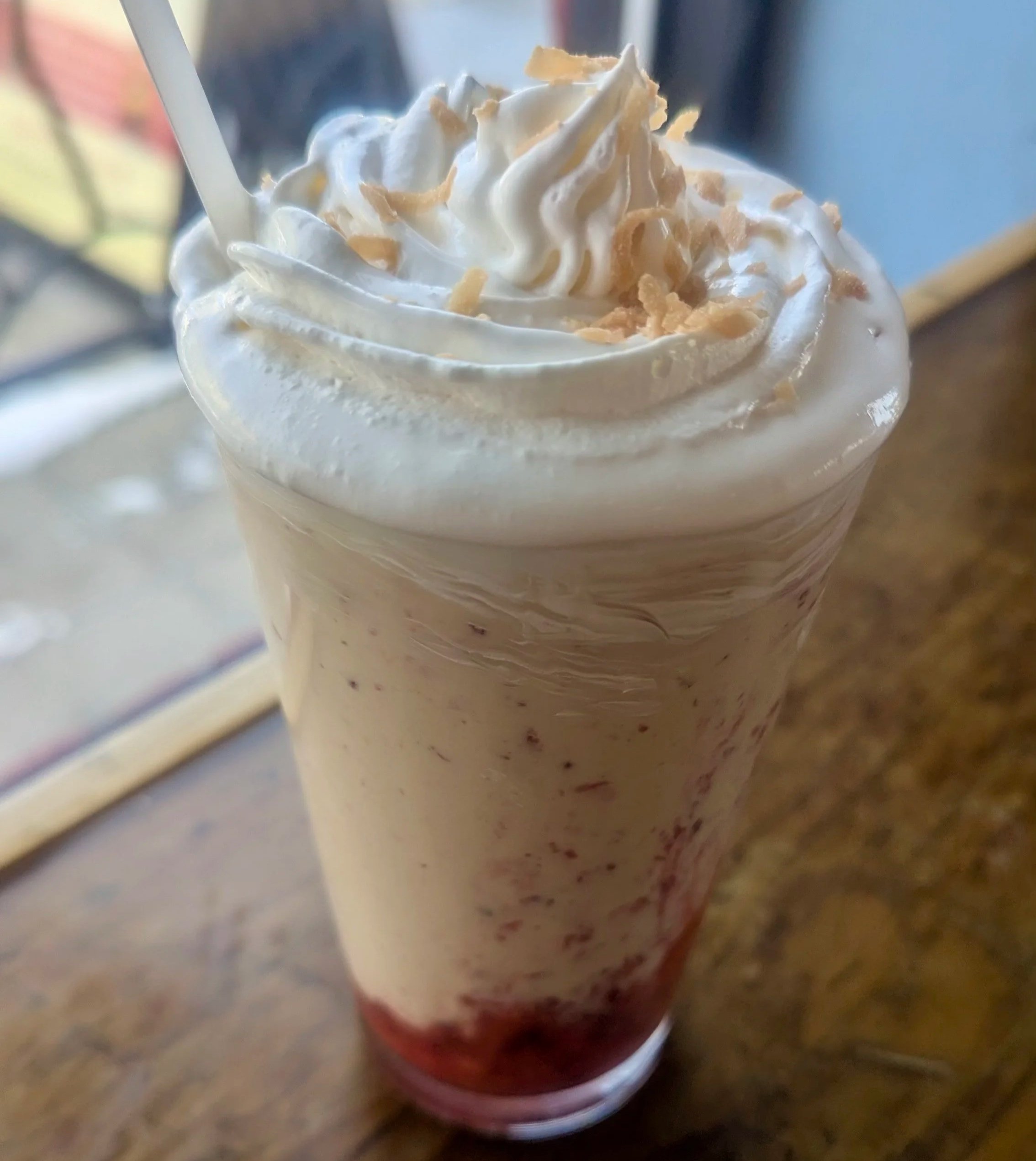 Mango & blackberry puree and mango syrup hand-spun with vanilla bean ice cream then topped with whipped cream and toasted coconut $9